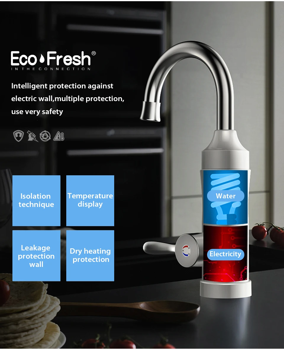 Ecofred-robinet chauffe-eau instantané sans réservoir électrique pour la cuisine avec prise ue LED.