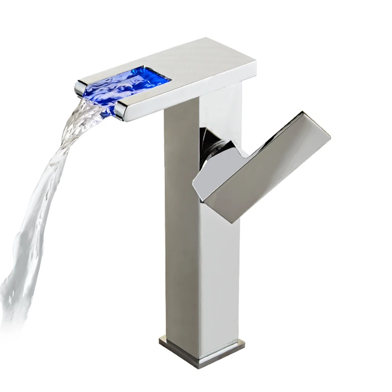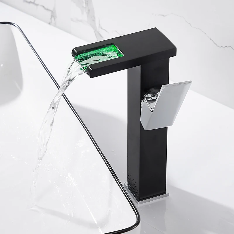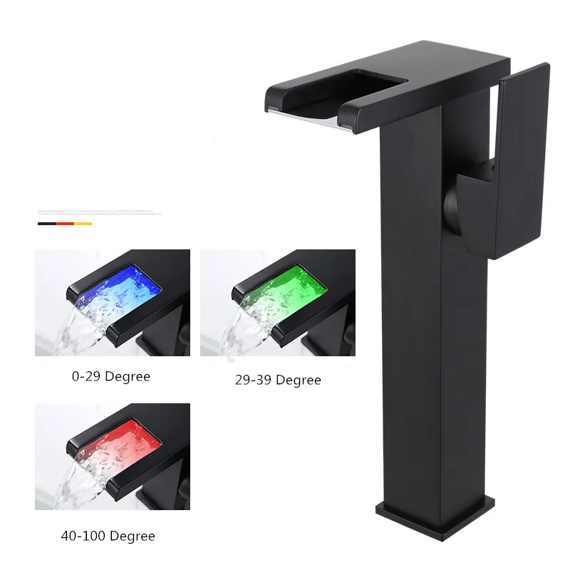 Tuqiu robinet de bassin LED salle de bain cascade robinet en laiton noir robinet de bassin. Mélangeur de salle de bain robinet mitigeur de lavabo monté sur le pont.